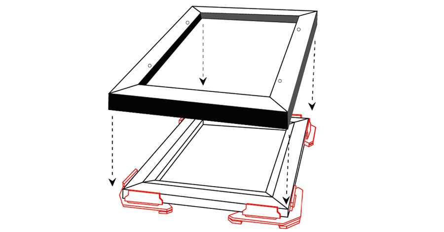 Aseta canvas-taulu kuvapuoli alaspäin pahvisiin kulmapaloihin ja paina sen jälkeen kehys paikalleen taustapuoli ylöspäin.