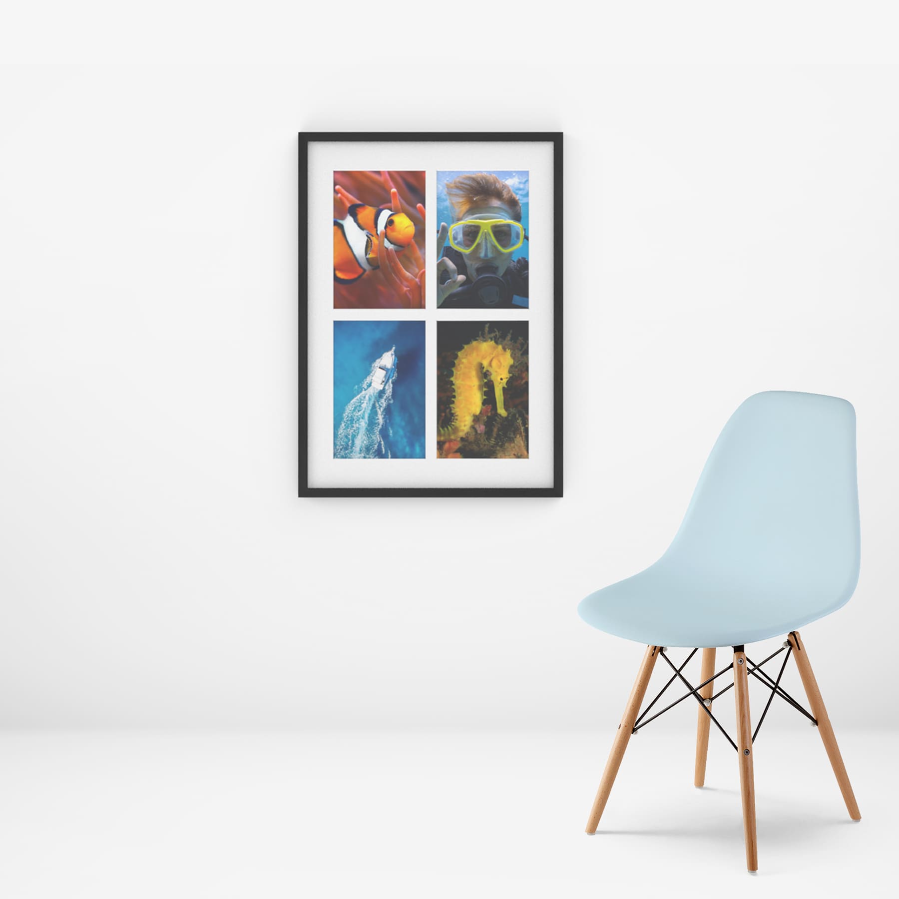 Your photos will be presented as a collage on a photo poster and they will be delivered in a wooden photo frame. You can hang up your new photo product right away in your favourite spot. Thanks to the UV-resistant shatterproof acrylic glass, your pictures will be protected from fading.
