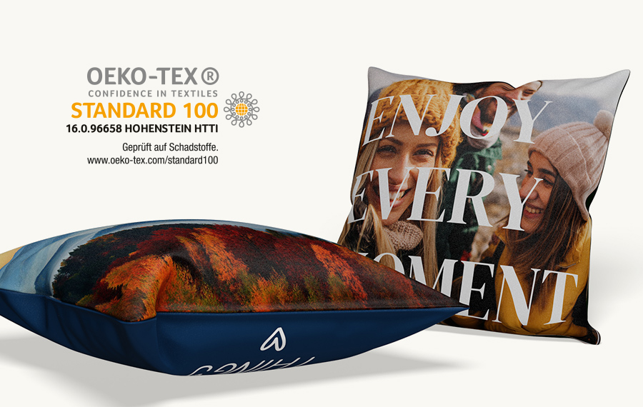 The ifolor Photo Pillow uses genuine quality product as the materials are certified according to Oeko-Tex® Standard 100 (certificate number D06-0499 / Product class I for baby articles). The outer fabric of the pillow is made of 100% polyester microfibre and the filling is 100% polyester wadding.