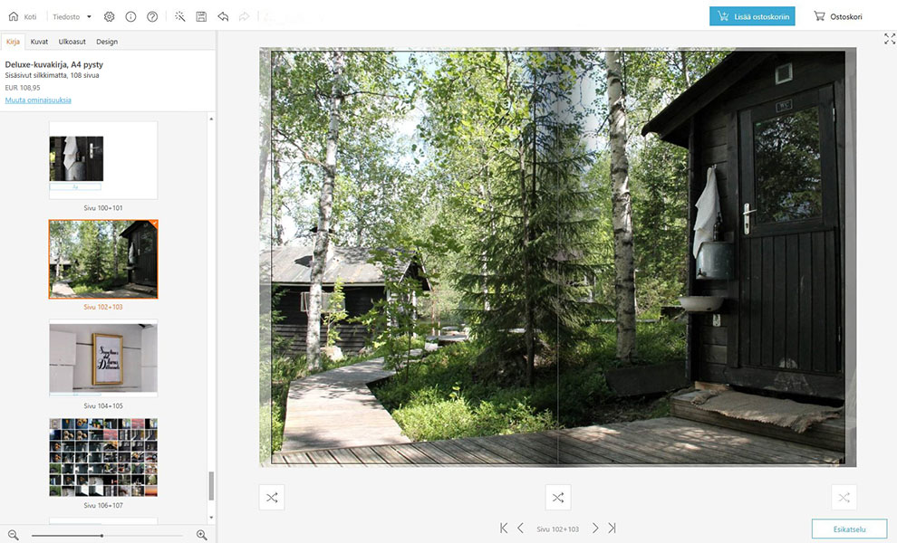 Tarkastele valitsemiasi kuvia. Kuvaatko enemmän pysty- vai vaakakuvia? Ovatko jotkin tietyt kuvat sellaisia, jotka haluat erityisesti kirjaasi mahdollisimman suurina? Mieti minkä mallisessa kirjassa juuri sinun kuvasi tulevat parhaiten oikeuksiinsa.