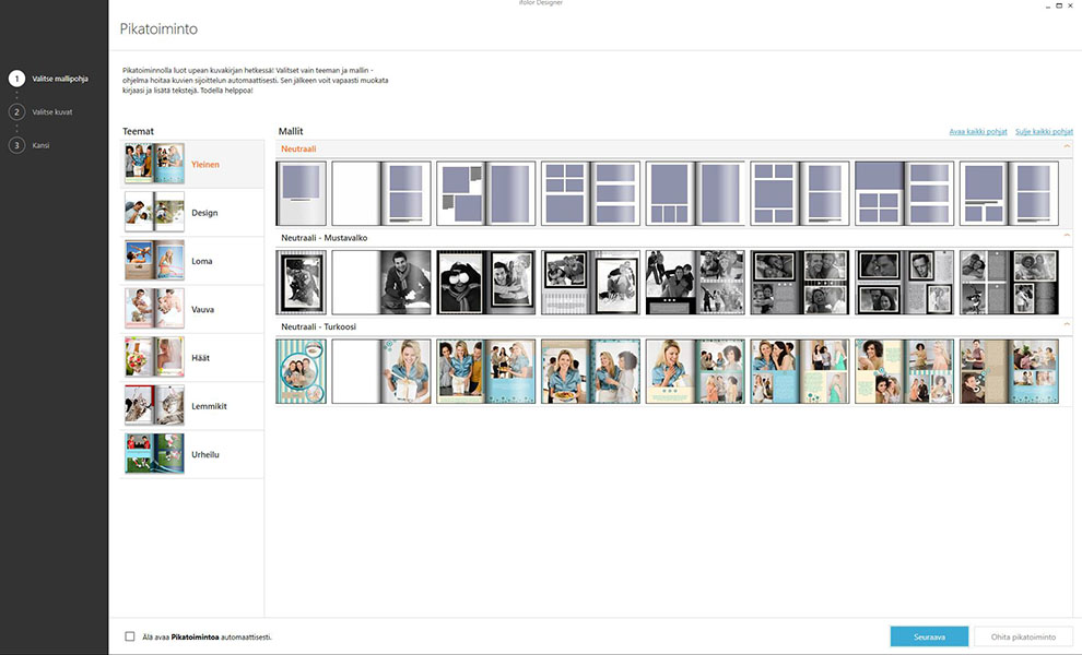 Designer-ohjelmassa voit valita kuvakirjasi tyypin useista erilaisista kuvakirjamalleista. Voit valita kova- tai pehmeäkantisen kirjan, suuren Premium-kuvakirjan, näppärän kokoisen Kuvakirjasen tai jotain siltä väliltä. Kuvakirjamallin valintaa helpottaa valitsemasi kuvakirjan aihe. Spiral-kirja sopii mainiosti reseptikirjaksi, Deluxe-kirja vaikkapa lasten satukirjaksi.