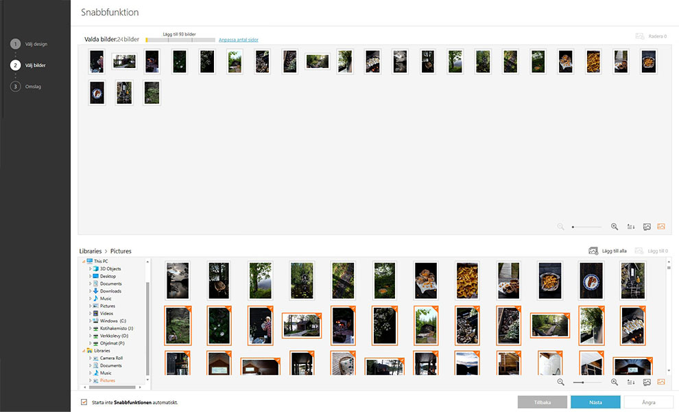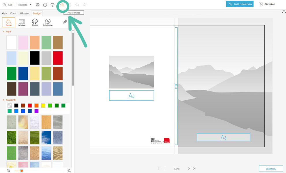 Jos tavoitteesi on saada kuvakirja valmiiksi mahdollisimman nopeasti ilman sen suurempia kikkailuja, on sinulla vaihtoehtona valita Pikatoiminto. Pikatoiminto löytyy yläreunan taikasauvan kuvan takaa. Pikatoiminnossa valitset haluamasi valmiin kuvakirjapohjan ja lisäät tarvittavan määrän kuvia. Tämän jälkeen ohjelma sijoittelee kuvat automaattisesti valittuun pohjaan.