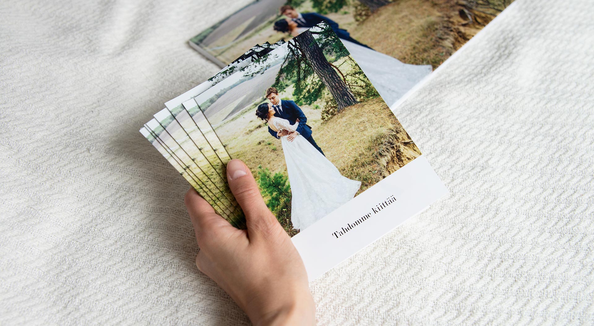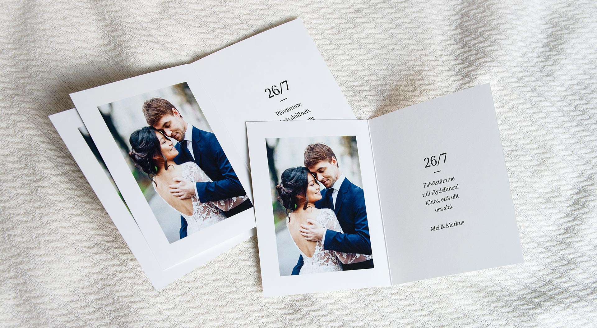 Jos haluat kiirehtiä, voit tilata kiitoskortit puhelimella. Jos haluat syventyä hääkortin suunnitteluun kaikessa rauhassa, tee kortti kätevästi tietokoneella. Designer-ohjelmaa käyttäen näet kortin ja kuvat isommassa koossa ja suunnittelu on helpompaa.