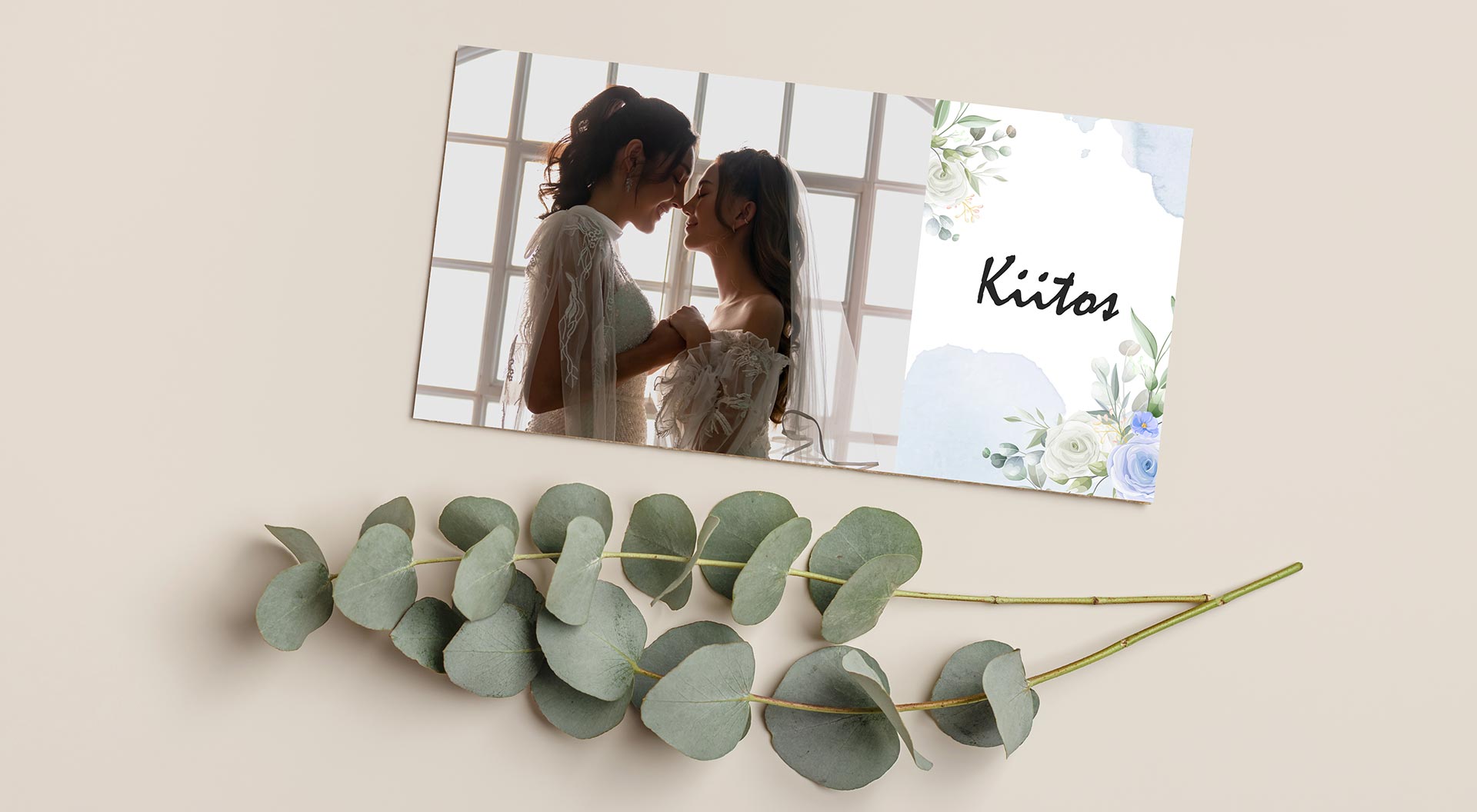 Olisiko joitain kaikkein läheisimpiä tai häihin suurella sydämellä osallistuneita mukava muistaa vähän isommalla hääkortilla? Kaasoille, vanhemmille tai muille kaikkein rakkaimmille on ihana antaa häiden jälkeen erityinen A4-kokoinen jättikortti. Siihen mahtuu yksi upea hääkuva tai monta erikokoista kuvaa hääpäivästä – ja jättisuuret kiitokset! Kiva arvostuksen osoitus on valita yksilölliseen jättikorttiin kuvia, joissa kortin vastaanottaja on itsekin mukana. Jos taas teetät samanlaisia jättikortteja useamman, saat hinnasta määräalennusta.