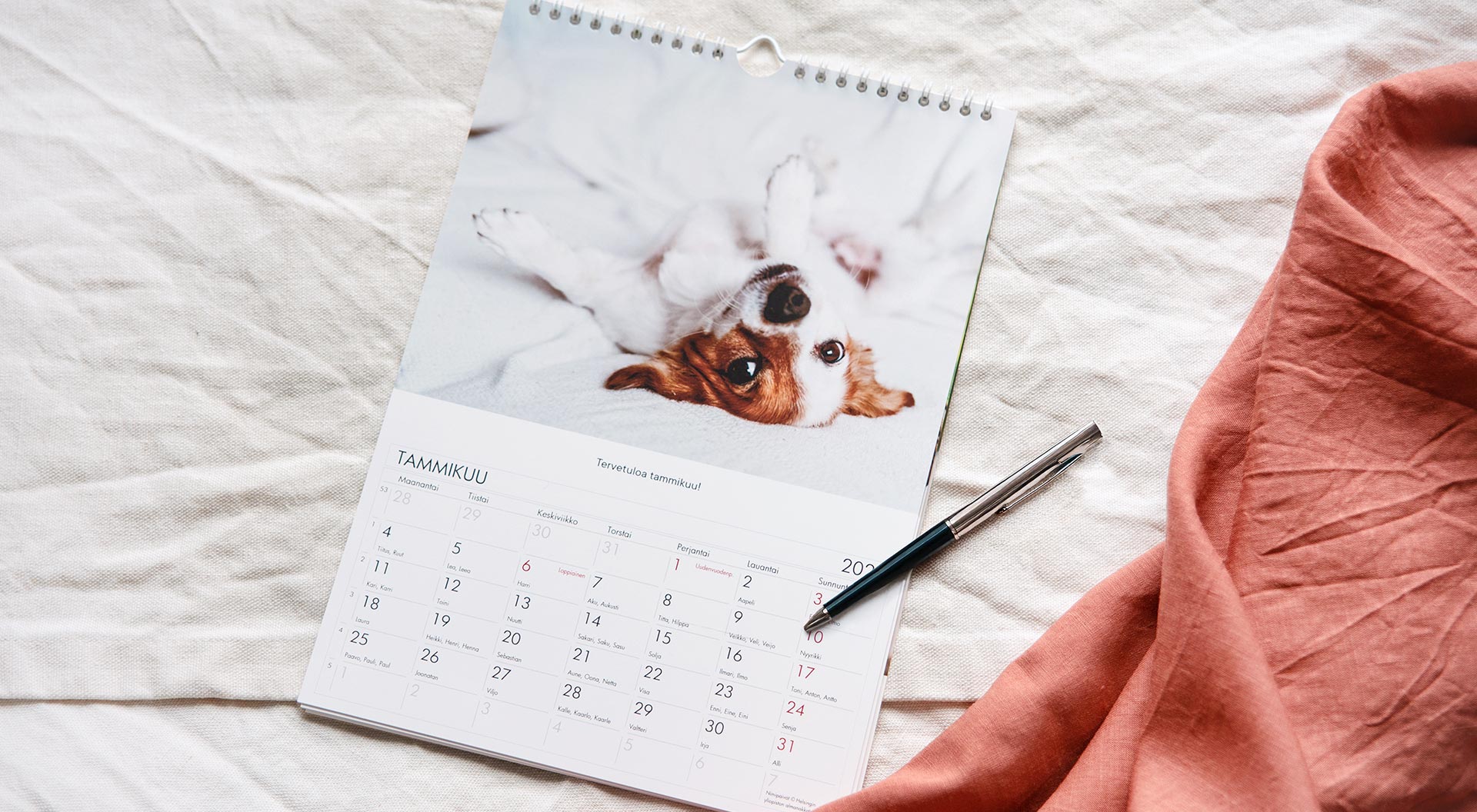 Lemmikille voi oikeutetusti hyräillä, että ”Sä kuulut päivään jokaiseen, sä kuulut aamuun ja iltaan”. Niinpä lemmikki sopii loistavasti itse suunniteltuun seinäkalenteriin. Lemmikki ulkoilemassa eri säässä, juhlien keskipisteenä, perhepotretissa – joka kuukaudelle löytyy hyviä kuvia. Eläinystävillä kuvitettu seinäkalenteri onkin kaunis sisustuselementti, jonka katselu saa aina hymyn huulille.