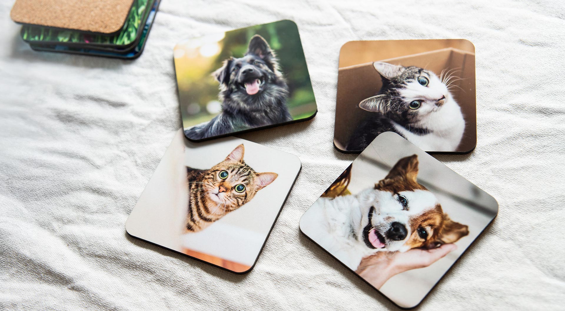 Viiru, Musti, Nöpö, Bella ja kaikki muut ihanuudet tuovat kuvillaan persoonallisen säväyksen käytännöllisiin lasinalusiin. Settiin kuuluu 4 tai 8 alusta ja jokaisessa voi olla eri kuva lemmikistä ilahduttamassa kahvi- ja mehuhetkiä.