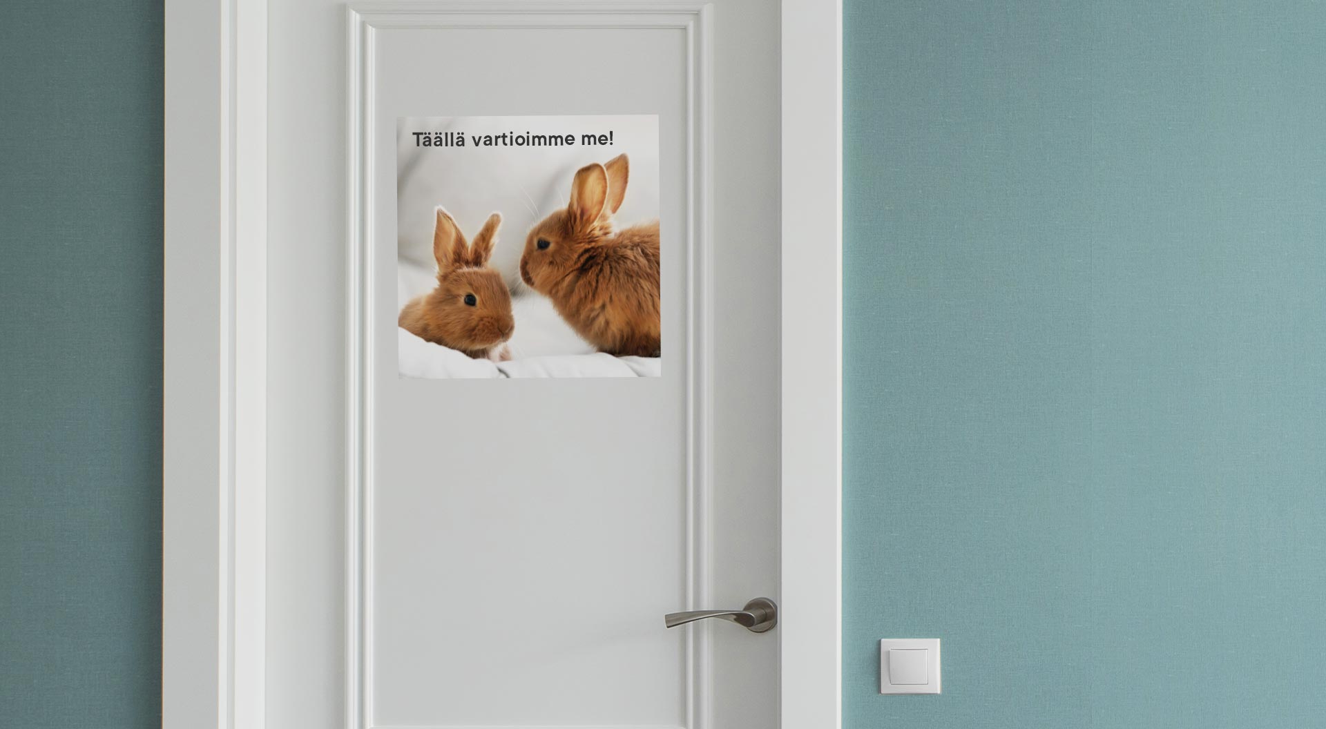 Jo ovessa voi olla vihje siitä, kuka kodissa asuu. Lemmikkikuva helposti kiinnitettävässä tarrajulisteessa saa tulijan ymmärtämään, kenen pillin mukaan tässä kodissa tanssitaan.