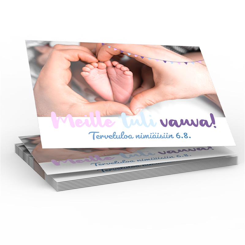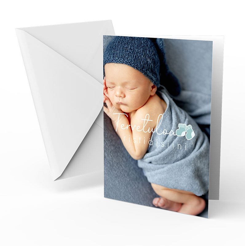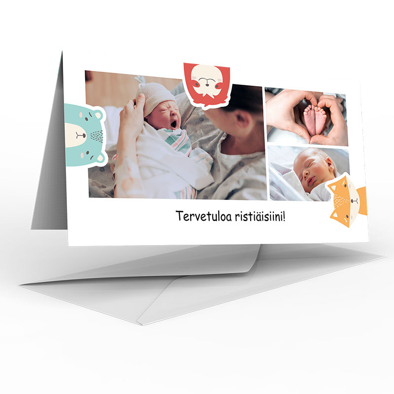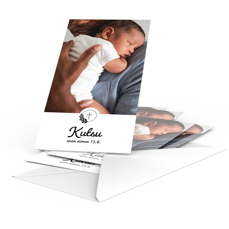 Vauvan ensimmäiset omat juhlat ovat ikimuistoiset. Suloinen valokuva vauvasta kutsukortin kannessa saa vieraat innolla odottamaan tärkeää päivää. Valmiita mallipohjia ristiäisten kutsukortteihin löytyy monenlaisia - hempeitä pastellinsävyisiä, klassisen tyylikkäitä tai värikkään leikkisiä.