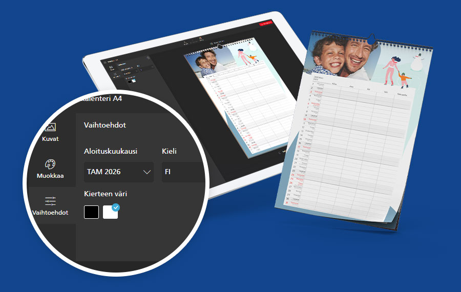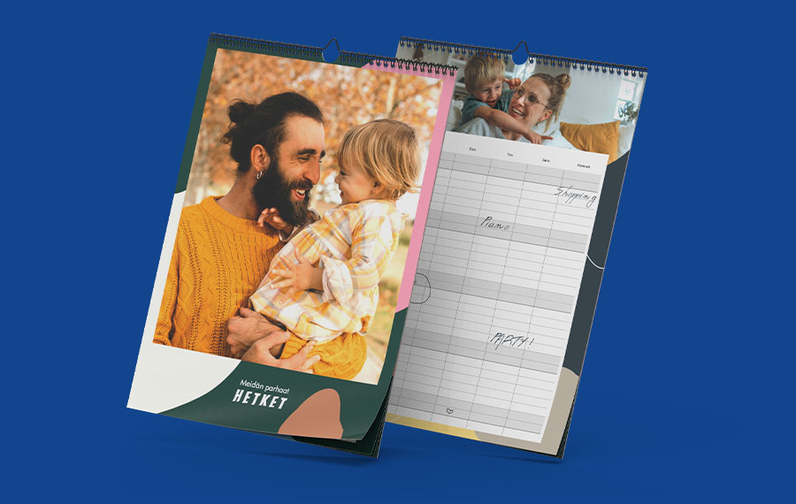 Laita menot muistiin! Perhekalenterissa on paljon tilaa tärkeille päivämäärille ja viisi saraketta, jotka voit nimetä kätevästi jo tilausvaiheessa. Suomenkieliset nimipäivät ovat kalenterissa valmiina kun tilaat netissä.