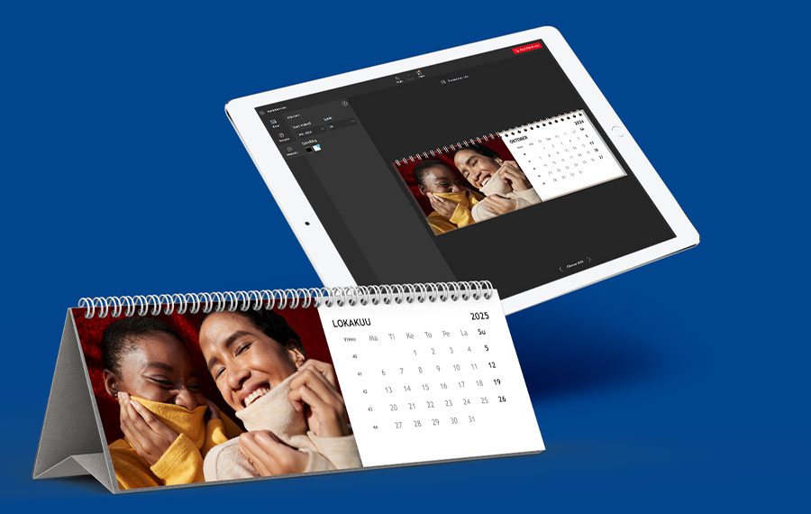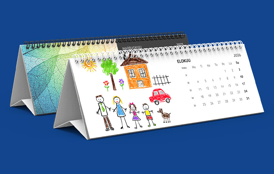 Kalenterisi tulostetaan paksulle 250g/m² paperille. Valitse kuvillesi silkkimatta tai kiiltävä pinta, molemmat toistavat kuvien värit erinomaisesti ja säilyttävät muistot elävinä. Kalenteriin mahtuu 15 suosikkikuvaasi: kanteen kolme ja joka kuukaudelle yksi. Kierreselän ansiosta pöytäkalenteria on helppo selailla.