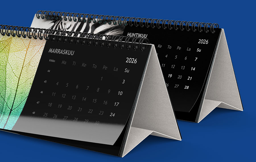 Voit valita oman pöytäkalenterisi alkamaan mistä tahansa kuukaudesta. Kalenteri voi alkaa ensi kuusta tai voit aloittaa sen yli vuoden päästä tästä hetkestä. Kalenterissa näkyvät myös viikkojen numerot.
