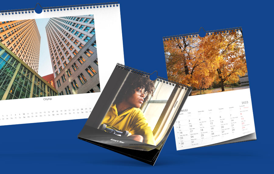 Meiltä voi tilata seinäkalenterin kolmessa eri koossa: A4, A3 tai trendikäs 21x21cm. Kaikissa nettisivuilta tilattavissa pystymalleissa on suomalaiset nimi- ja juhlapäivät valmiina.