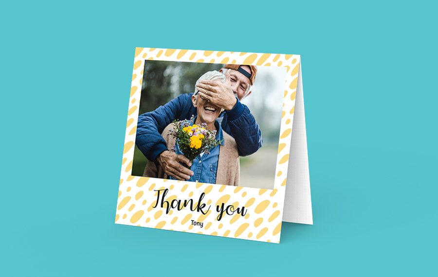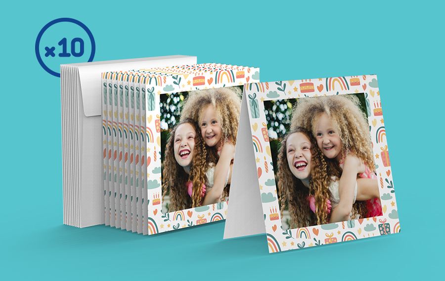 Neliökuvista on somen myötä tullut trendikkäitä. Myös painetussa kortissa neliökuva näyttää hyvältä, sillä tätä kuvatyyppiä olemme tottuneet katsomaan. Tee siis modernit kutsukortit, kiitoskortit ja muut elegantit tervehdykset neliön muotoon käyttäen omia valokuvia!
