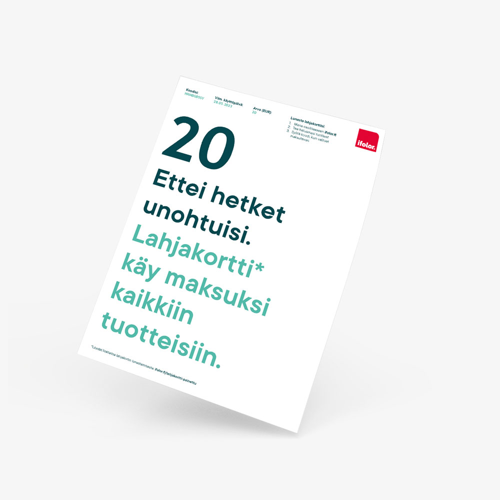 Ifolorin suosittujen lahjakorttien arvo on 20, 50 tai 100 euroa. Jos lahjan saaja tekee ifolorilta kokonaissummaa pienemmän tilauksen, loppuosa säilyy asiakastilillä. Tilauksia voi siis tehdä useammassa erässä tarpeen mukaan. Lahjakortin käyttöä ei tarvitse kiirehtiä, sillä se on voimassa vuoden ajan.